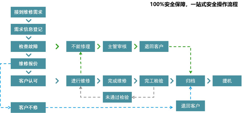 我们在收到您所要维修的货物后,我们将在第一时间通知您。并将在24小时之内给您以下答复:您所寄的货物的故障,是否可以修复,修复时间,修复费用。